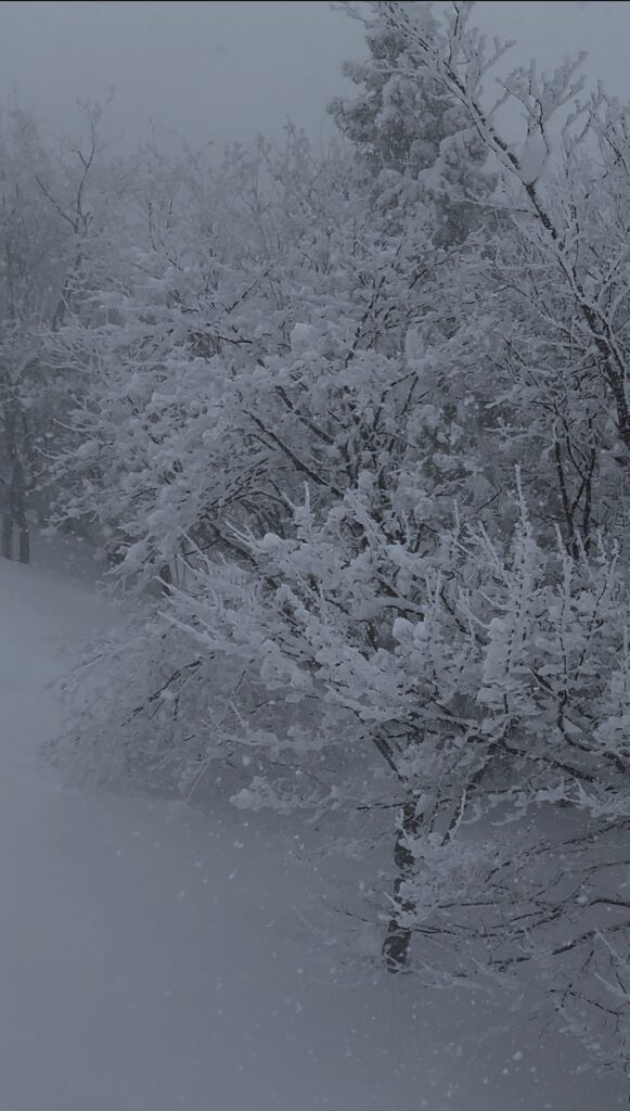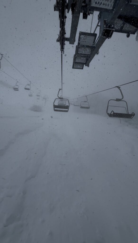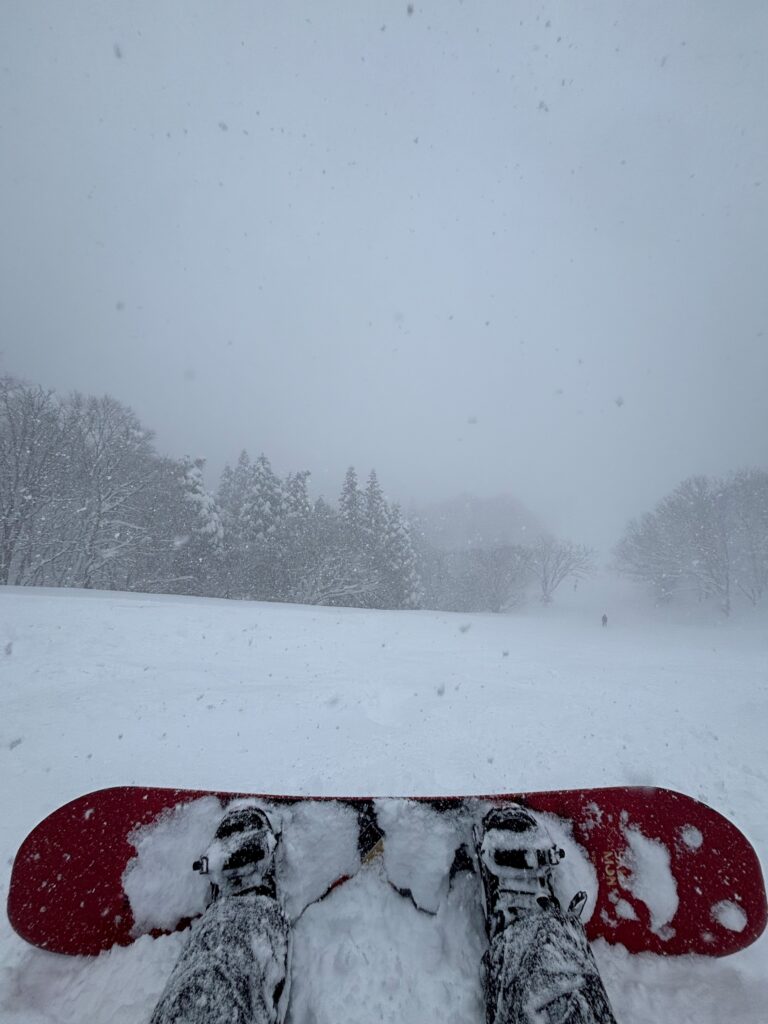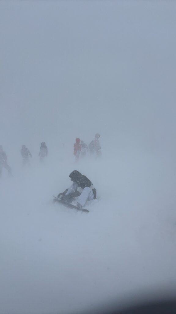 「大寒波」の朝は途轍もない吹雪で、ゴーグル無しでは目を開けることもできませんでした。初日は足首の高さだったスキー場の雪も一晩で膝の高さにまで成長していました。少しの恐怖心と好奇心を携えて慎重にリフトへ進みます。猛吹雪で前が見えずコースを逸れ、誤って首の高さの雪の中に突っ込んだ時は救助を呼ばなければならないかと思いましたが、なんとか雪から脱出し降りてこられました。無事に戻り、着替えてバスの停留所で待機していましたが一向にバスが来ないので連絡してみると、大雪の影響で高速道路が通行止めになっていて遅延するということでした。
